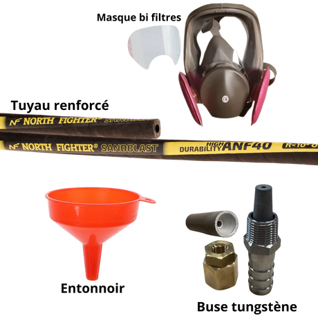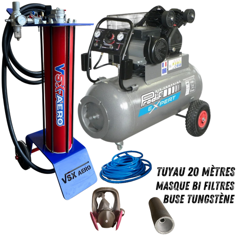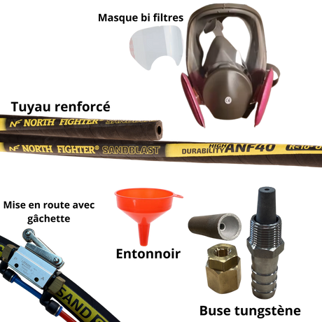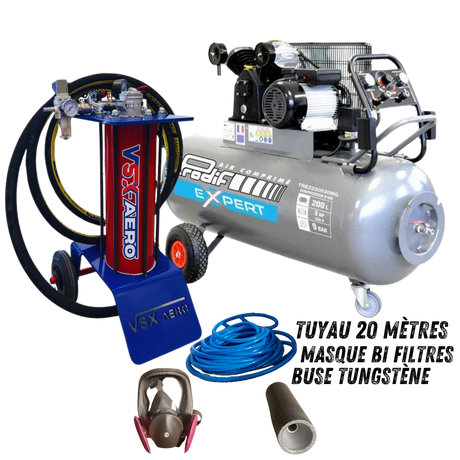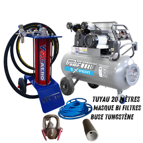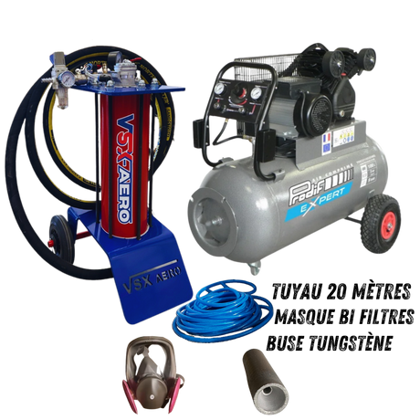 Kit complet avec aérogommeuse, compresseur 4 CV , tuyau de raccord 20 mètres et accessoires ( Buse tungstène, porte buse, cagoule de protection.)